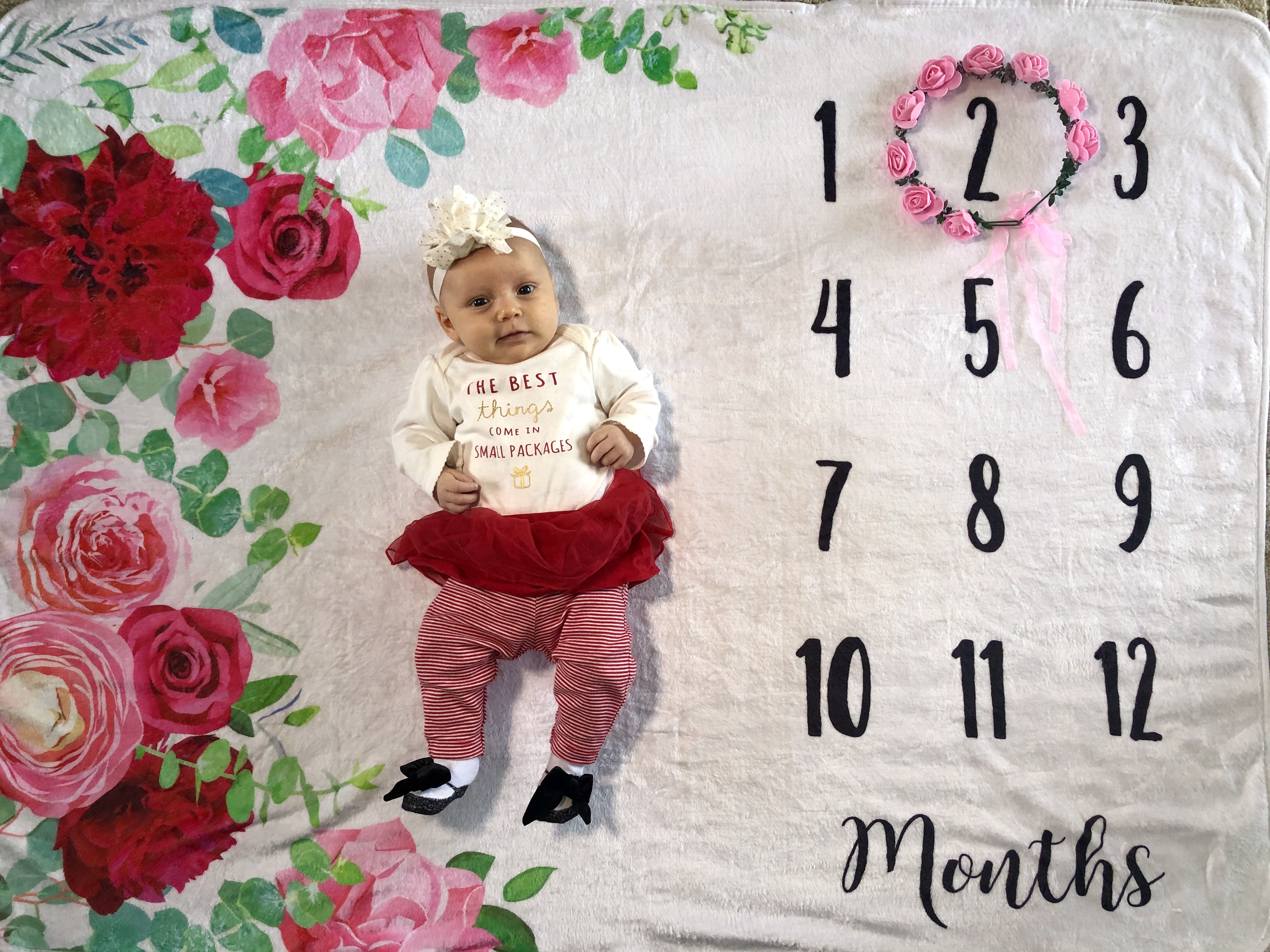 It’s been fun keeping track of baby’s growth by taking a photo of her on the same blanket each month!