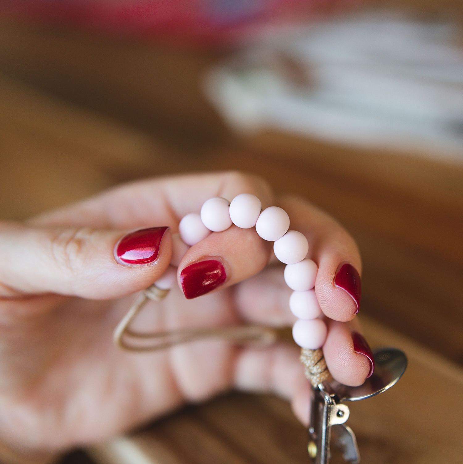I have the Brooke Cutie Clip (pictured in pink beads) and the Gentry Cutie Clip (pictured in gray beads…..the Gentry is a little shorter than the Brooke), as well as the Lotus Cutie Clip (in the pink braided leather).