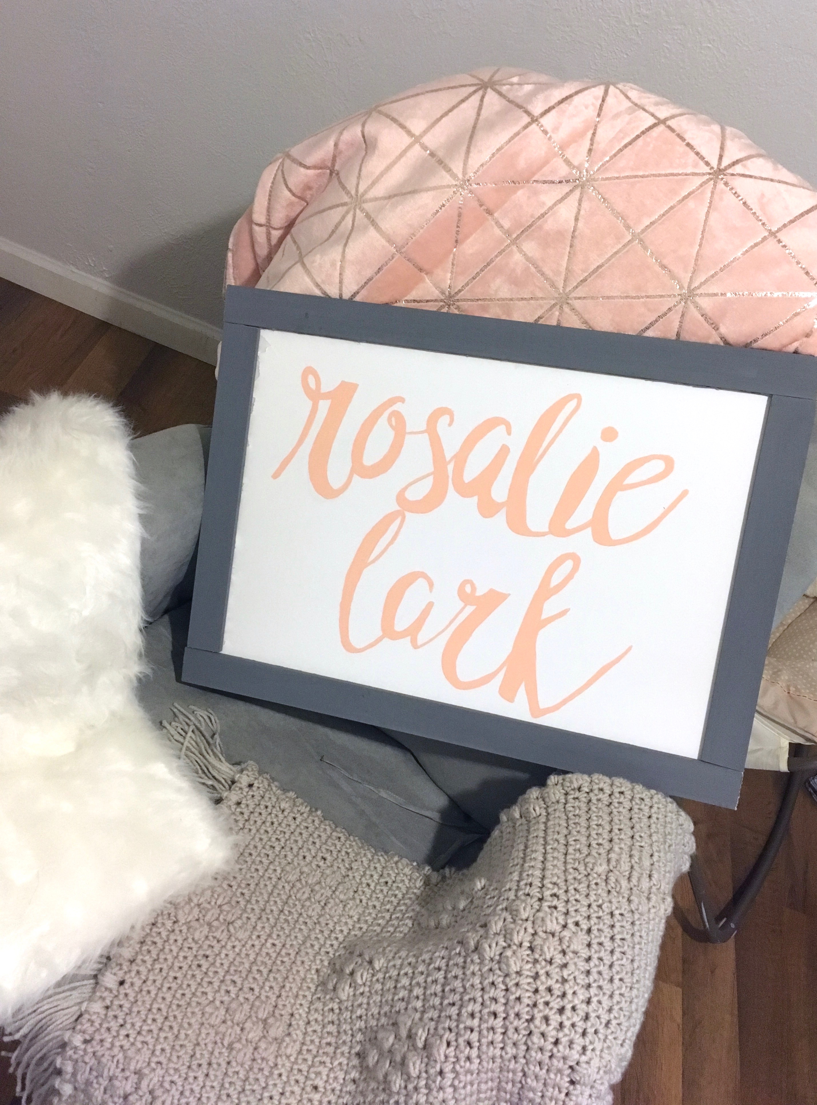 There are sooo many cute name signs on Etsy and I knew I *needed* one for above the crib 😀 I experimented and tried writing her name in pencil on foam board from Hobby Lobby, then painting with acrylic paint (which I could choose in my exact color!). I then framed it with hobby wood from Home Depot that I painted a dark grey (acrylic craft paint), then hot glued it around the foam board to frame it in. Couldn’t have been simpler, or thriftier.