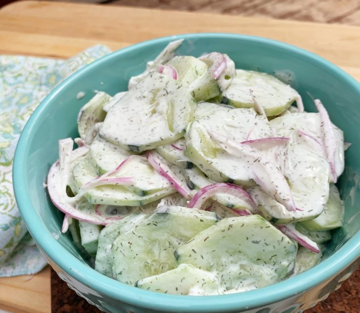 A cool & creamy cucumber salad dressed in dill and sour cream.