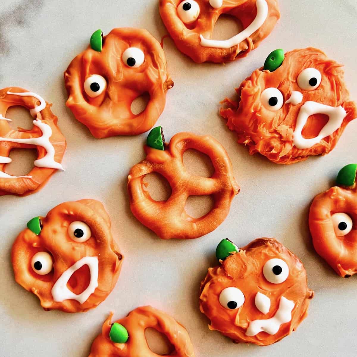 Why these snacks work: they’re simple to pull together, double as festive treats and party activities, and mix healthy snack options (apple slices, greek yogurt) with indulgent sweet treats (pumpkin pie–inspired dips, turkey Oreo balls). They’re a perfect way to keep tiny hands busy and full. From pretzel sticks turned into pumpkin stems to hand held s’more pops. Ready? Here are the ideas: