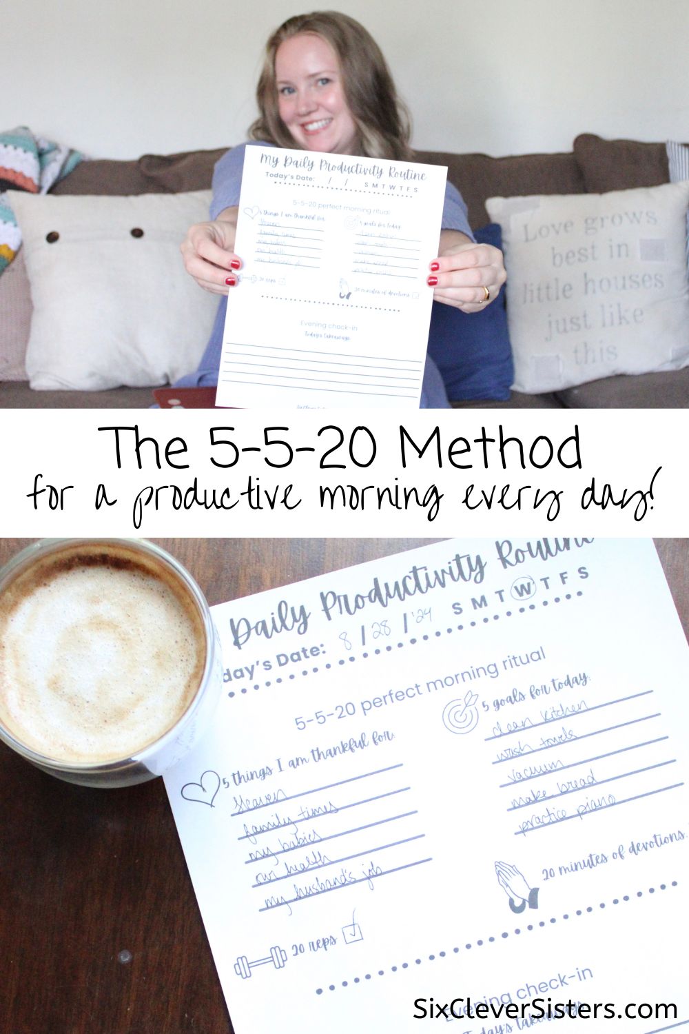 Productivity | How to Be a Morning Person | Daily Productivity Routine | 5-5-20 Method | Morning Routine | Finding a Morning Routine | Learn how to become a productive morning person using a method called the 5-5-20 method at SixCleverSisters.com