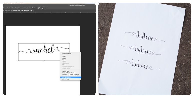 So if you DO want your sticker to be on the inside, remember to make a mirror image, or your name/text will end up backwards!! I was working in Photoshop, so I just hit Command-T for “Free Transform,” and then I right-clicked and went down to “Flip Horizontal.” Some printers allow you to print the mirror image, though, so see what your options are.