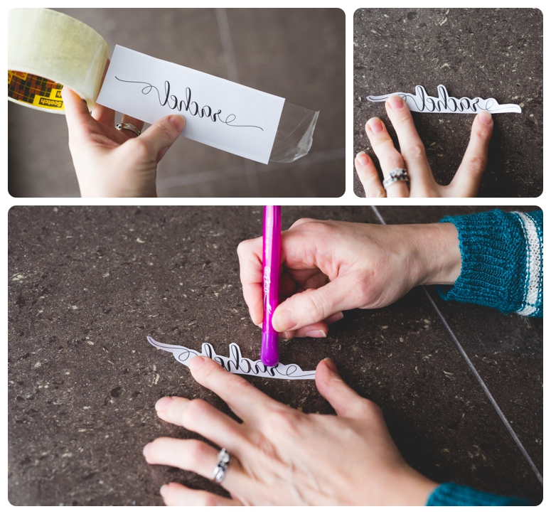 Ok, so once I had printed my name backwards, I put Scotch packing tape over one of the names and cut it out pretty close…and then I rubbed-rubbed-rubbed the tape onto the ink like they say to do.