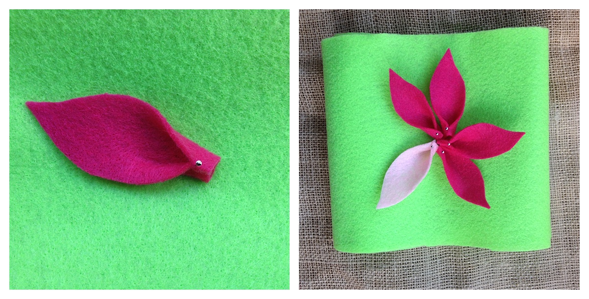 Start with the 5 large petals. Using the straight pins, pinch the felt as pictured and push the pin through.