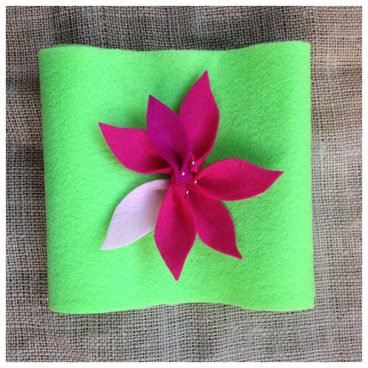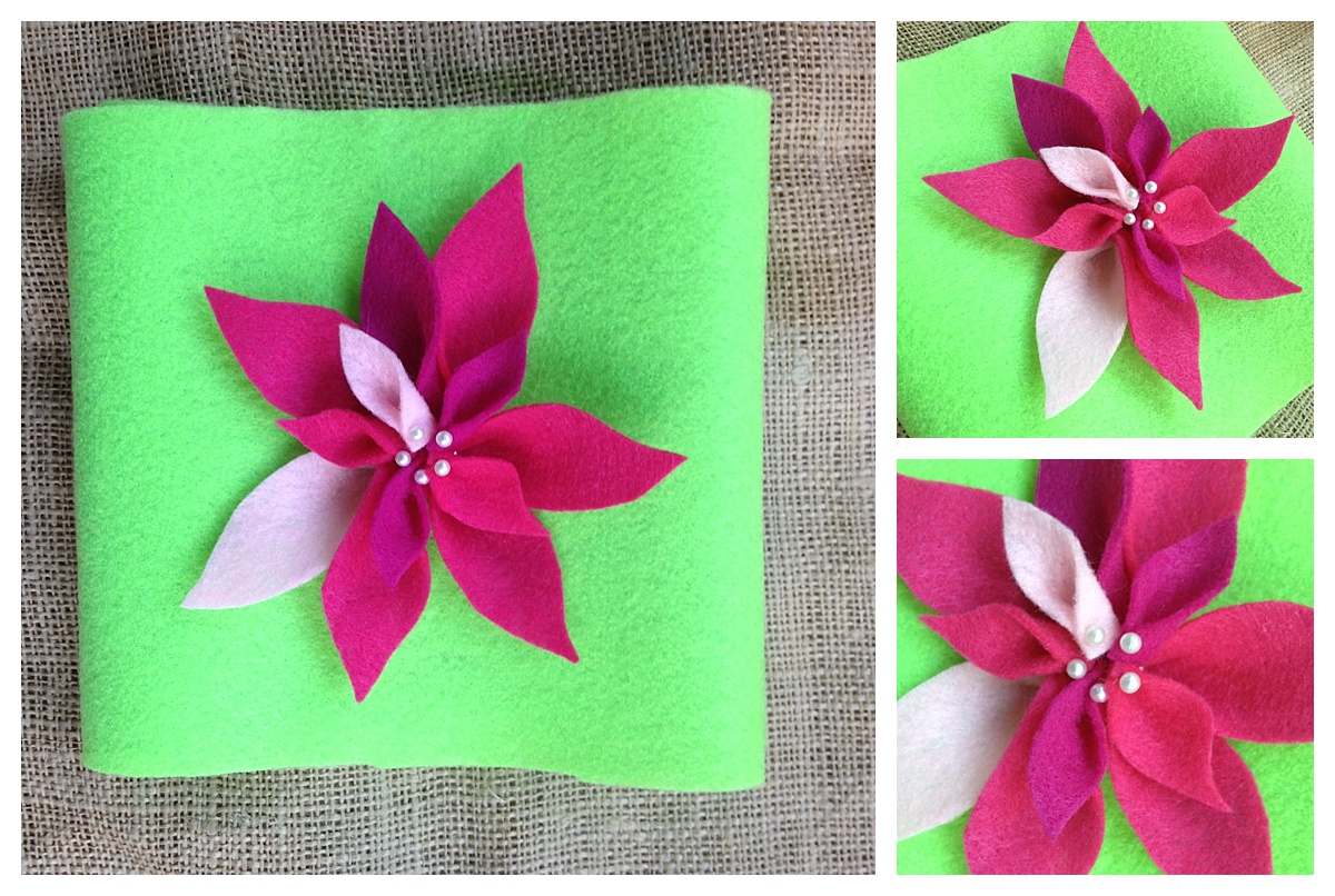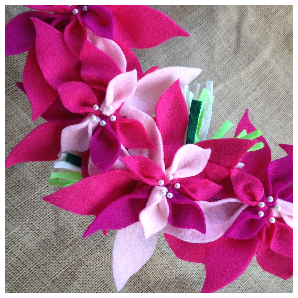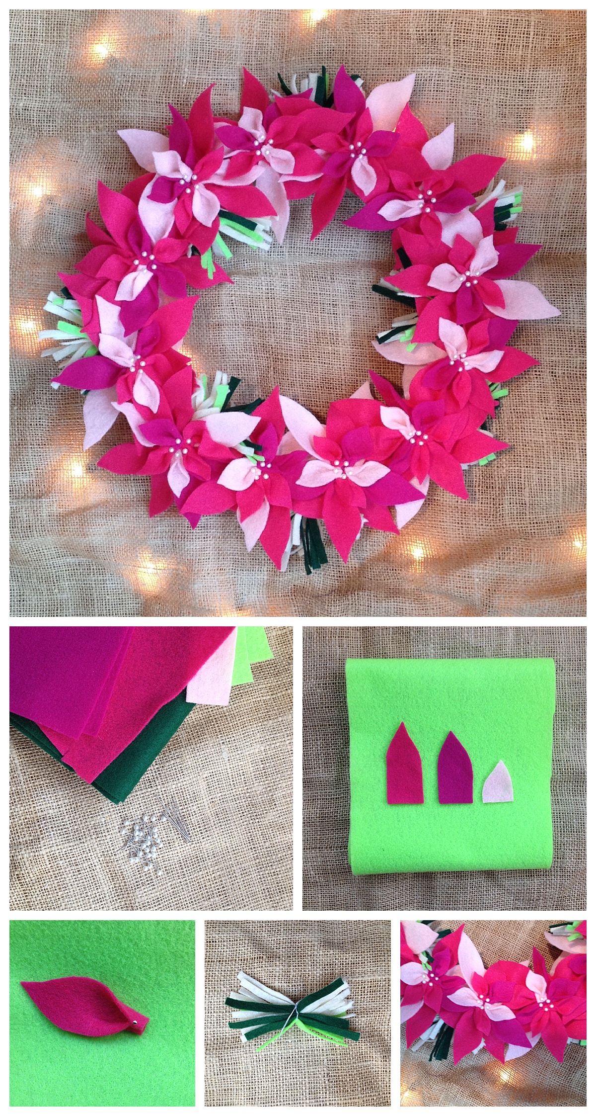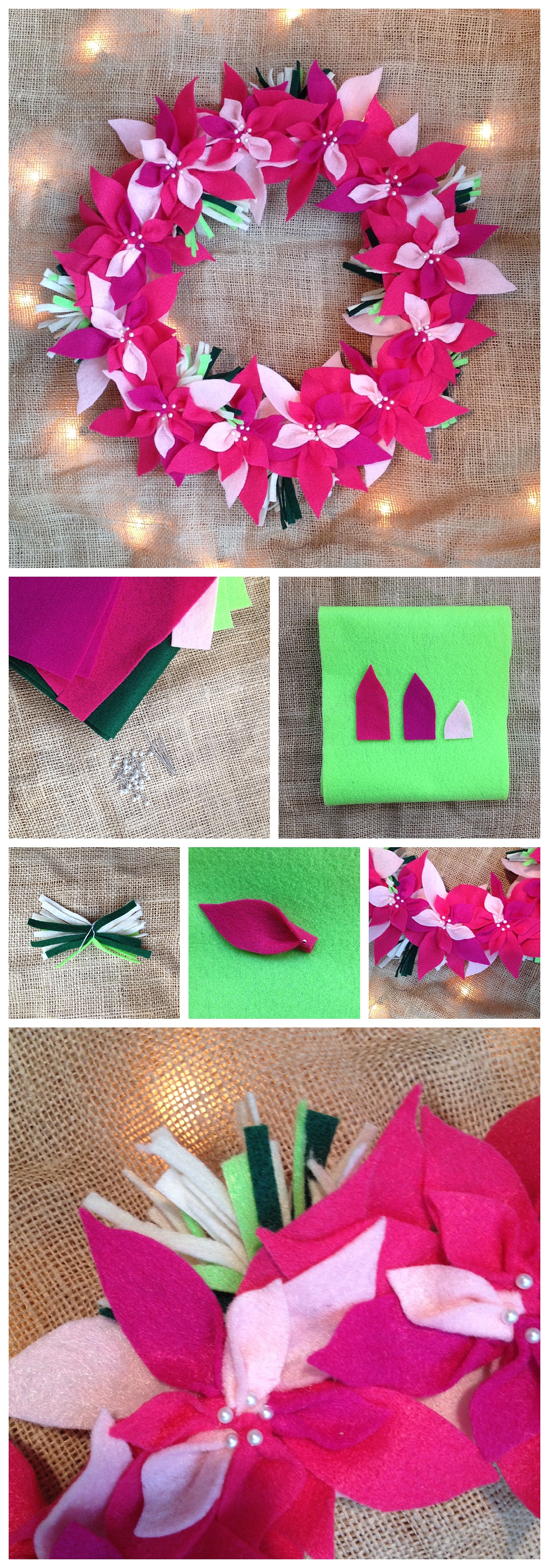 Now I’ll show you how to put together each poinsettia. I’m going to show you on the green felt background so that it’s easy to see, but you’ll want to pin them directly on the wreath.