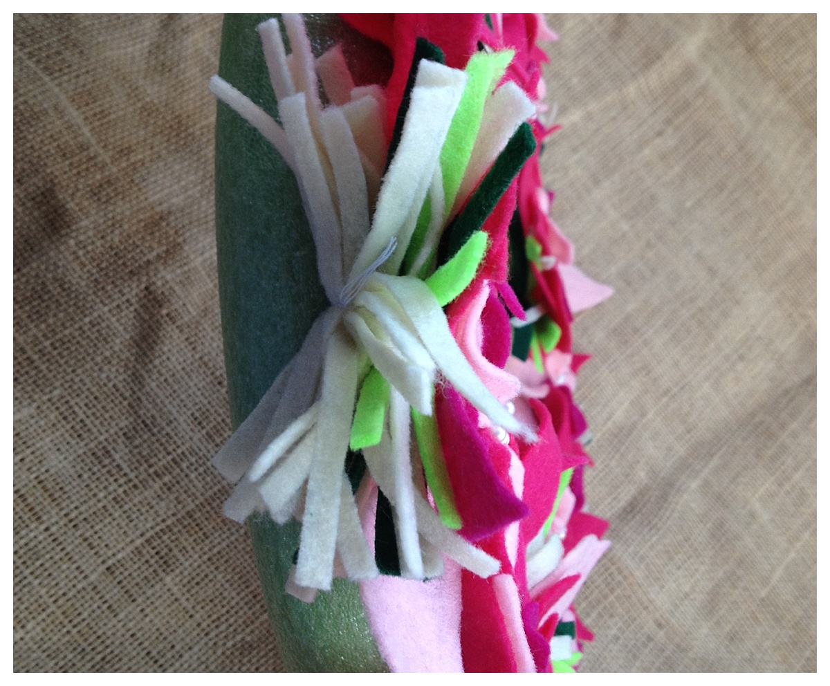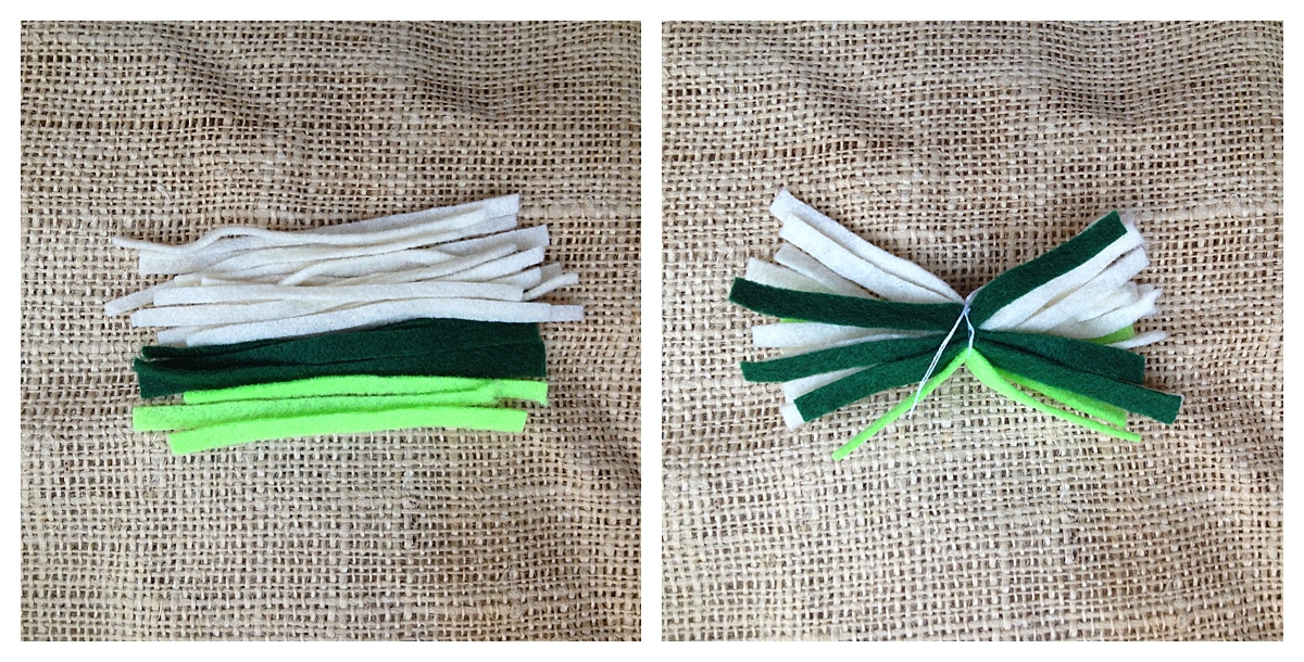 To make the leaves, cut your greens and cream felt into narrow strips about 3 inches long. Bundle about 12 cream strips, 3 dark green strips, and 3 light green strips. Tie them together with a piece of thread and fluff.