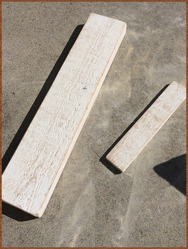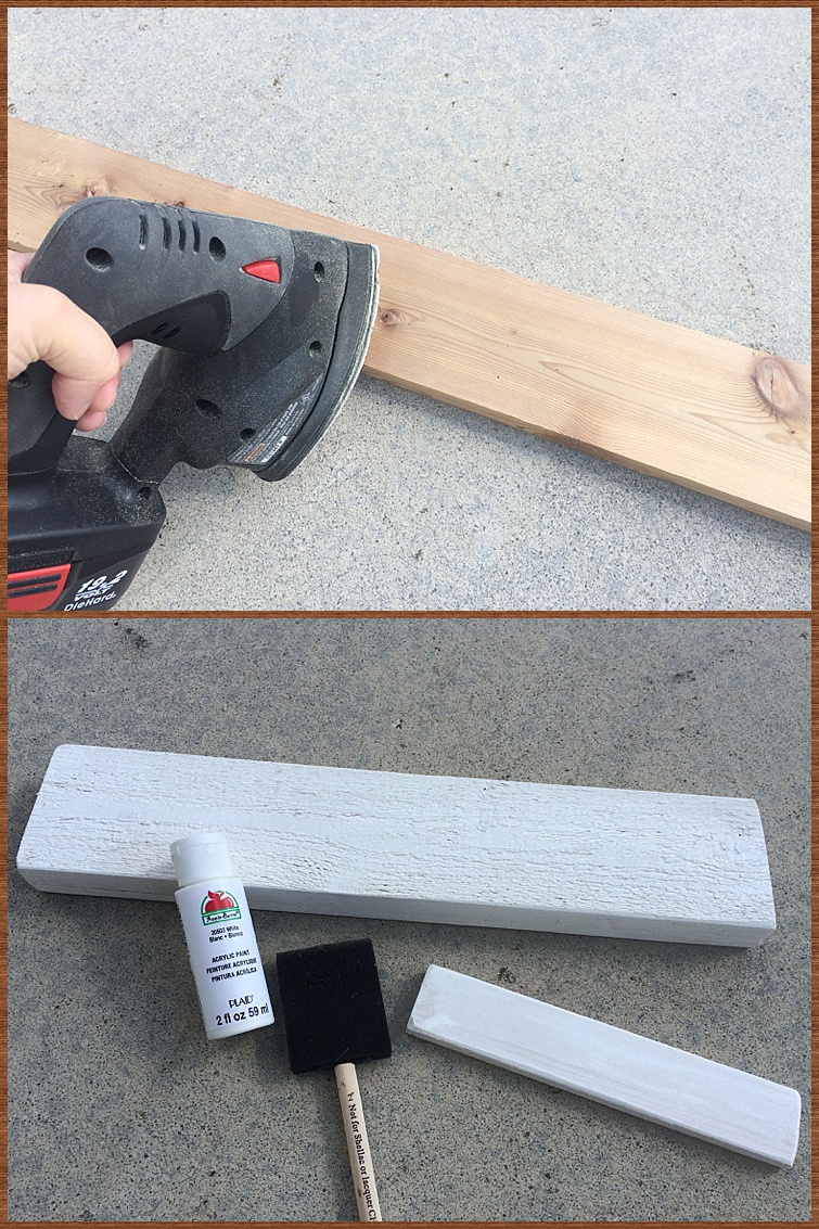 Then, using the white acrylic paint and a foam brush, cover the entire pieces of wood with a thin coat. It doesn’t have to look perfect, you will be firmly sanding it soon!