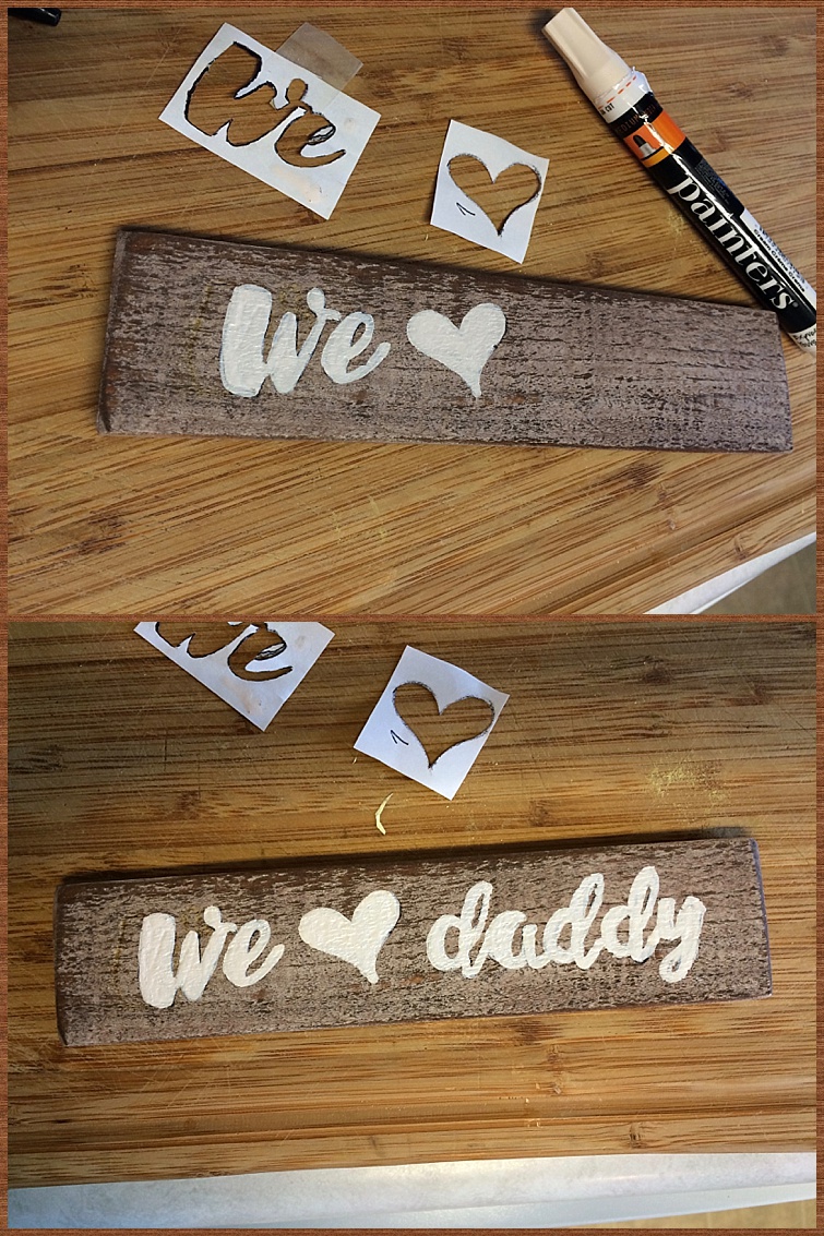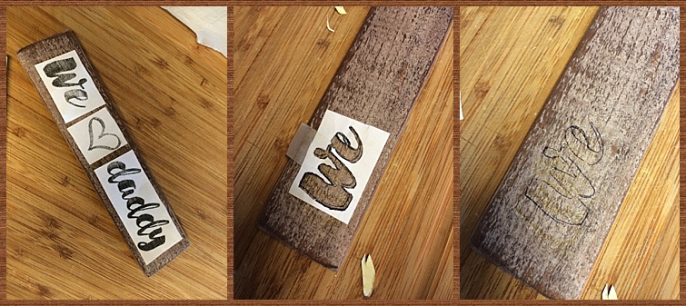 I cut my black & white photos to 3 1/2″ squares and printed out ‘We Love Daddy’ in the font and size that would fit on my small piece of wood.
