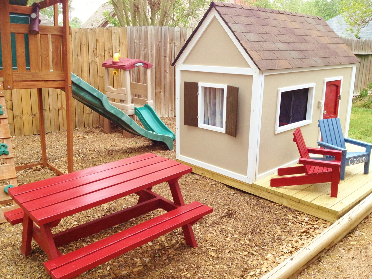 - Customizable: With DIY plans, you can design a playhouse that suits your yard size and your child’s preferences. Add a front porch, a flower box, house numbers, a climbing wall, a front door, fence pickets, plexiglass windows, or black sconces. You name it, you can do it! Choose a unique color scheme, and even add Christmas lights or a little picnic table for the season!
