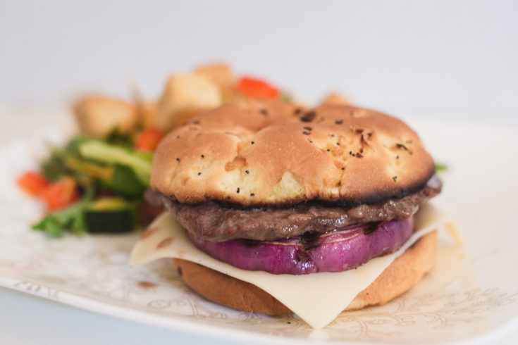 Layer a piece of provolone, a grilled onion, and a juicy rib eye steak on your crispy onion bun. Drizzle with a little steak sauce over the steak and you’re finished! Serve these sandwiches up with a fresh salad for the perfect summer meal.