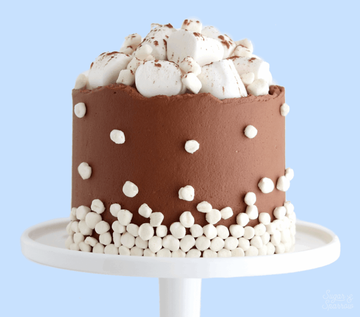 Layers of hot cocoa infused cake, hot cocoa flavored buttercream, and marshmallow fluff – inspired by a cup of hot cocoa with marshmallows!