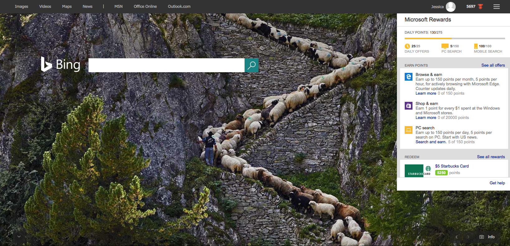 Each day, you’ll be able to earn the following points when you use bing as your search engine: