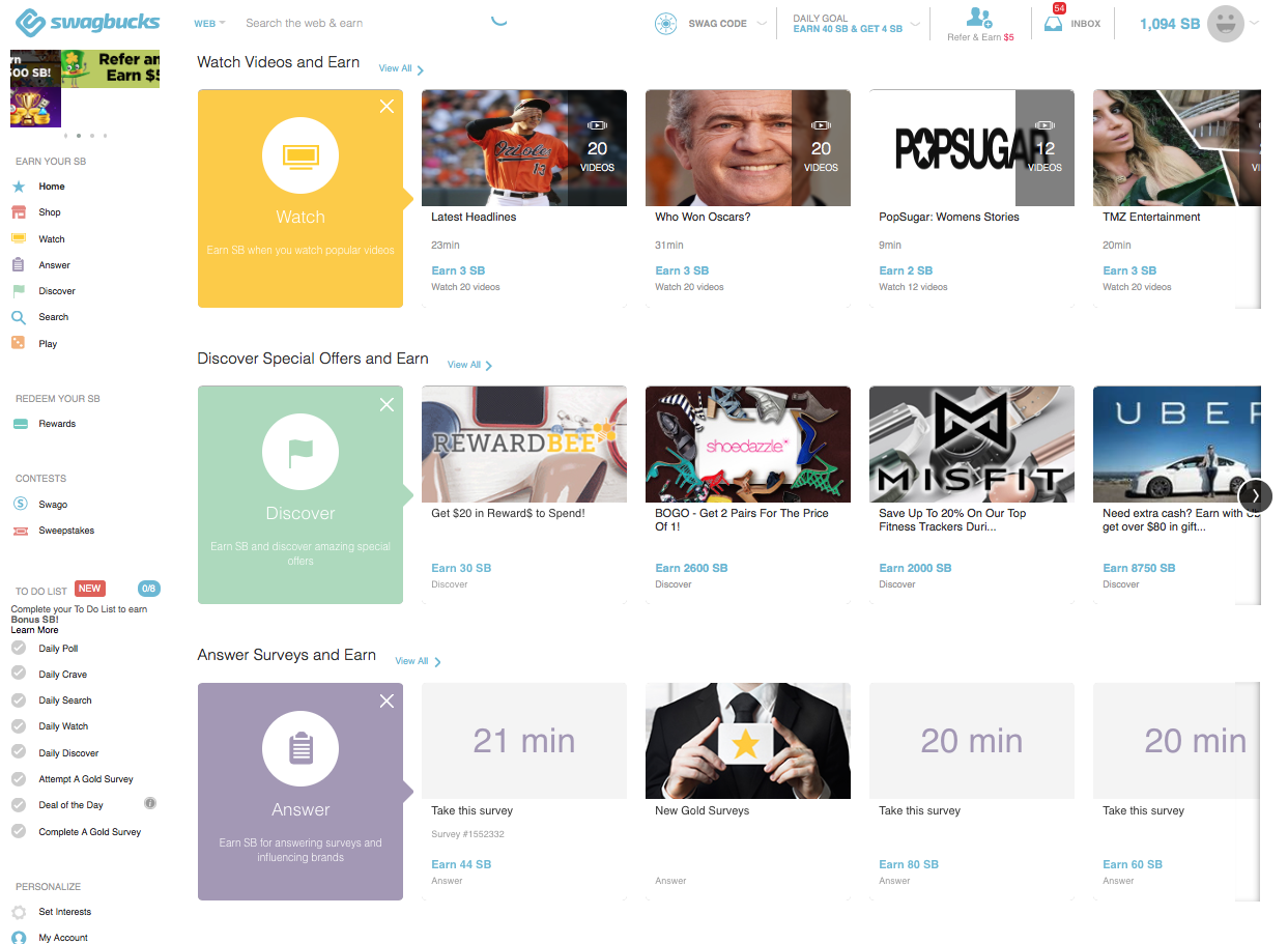 The video here can explain this better than I can, so you’ll probably want to watch that first. For me, it took a little while to get used to getting around on Swagbucks site, figuring out what and where everything was and how to earn points. But, once you get the hang of it, it’s not difficult at all.