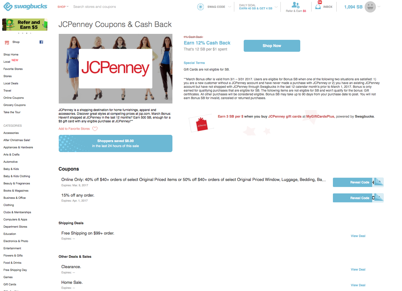 Say I’m looking to shop on JCPenney.com. Click on the Shop Now button. It will then redirect you to JCPenney.com to start your shopping. Notice the word Coupons in the picture below. This is where you will find available coupons for the site you’re shopping on. If you see something that would be helpful to you, just choose to reveal the code and you’ll be asked to paste the code at checkout.