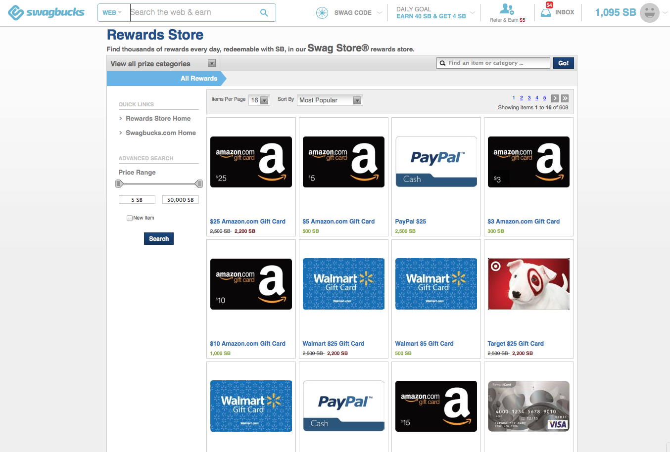 Here you’ll find a myriad of stores to choose from, including Walmart, Amazon, Target, Starbucks, Ebay, gas gift cards, etc. You can choose Paypal if you’d rather have the cash. There are MANY options!