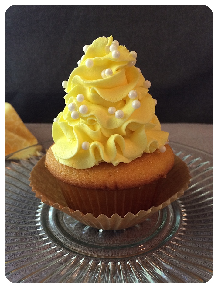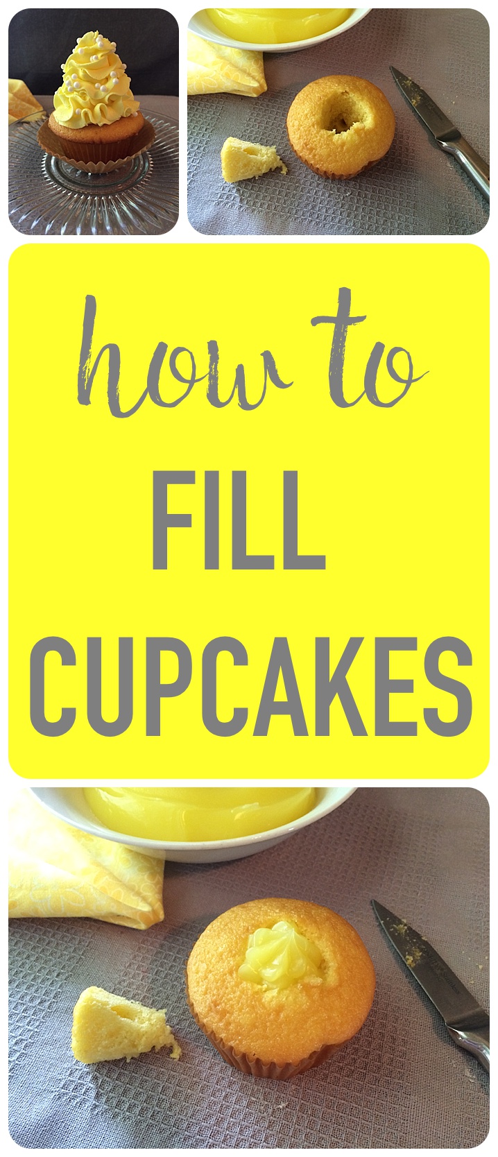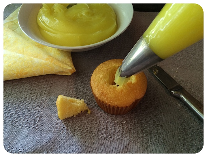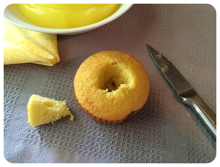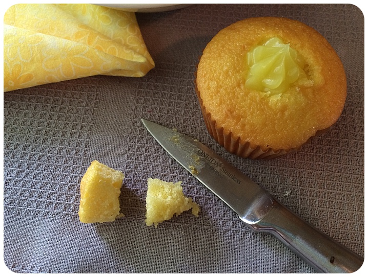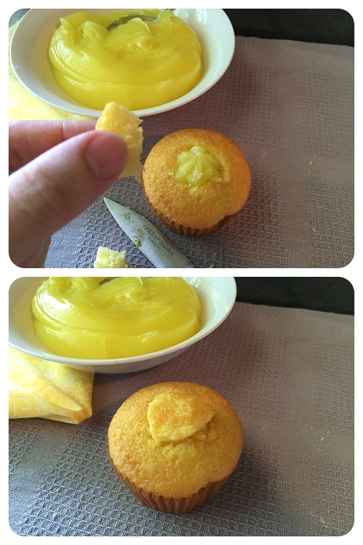 Gently squeeze some filling into the center of the cupcake. (For these certain Luscious Lemon cupcakes, I am using Duncan Hines lemon pie filling. It pairs perfectly with the lemon cake and lemon buttercream.)