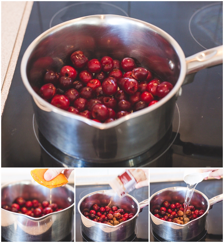 This cherry compote recipe is really simple! You’ll need 3 cups of pitted cherries (HERE is an easy trick to get those done quickly!)