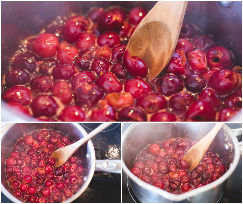 You’ll let your cherry compote sit and cool off — don’t worry if it seems thin, because it will thicken as it cools!