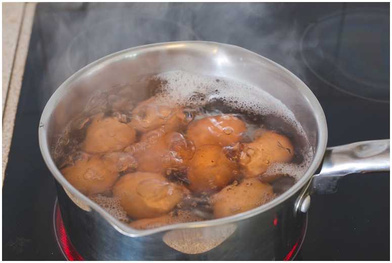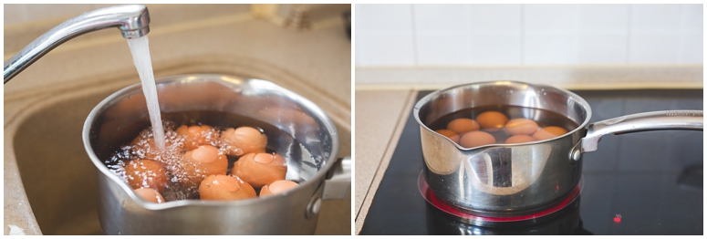 So I noticed that when I came home with my room temperature eggs and left them out to be immediately hard-boiled, those eggs would turn out perfect and easy to peel. When I took eggs straight from the fridge to the pan to hard-boil (being from the U.S., I refrigerate mine out of habit, even though it’s not necessary :-P), the peel would stick to the egg, and unless I spent an hour carefully peeling them, they wouldn’t turn out very pretty! So I tested what I had figured out to see if any other variables made a difference, but it all boiled down to (no pun intended, ha!) whether they started out cold or at room temperature. So get your eggs out an hour or so before you boil them and prepare to be amazed! Here’s how I hard-boil my eggs.