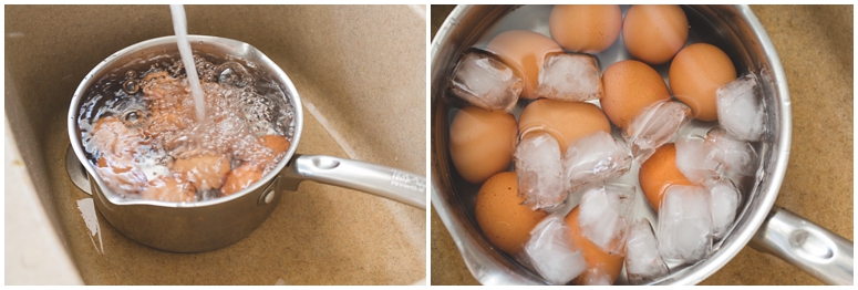 5. Drain the hot water off the eggs, rinse with cold water to cool them off, and let your eggs sit in an ice bath for 5 minutes.
