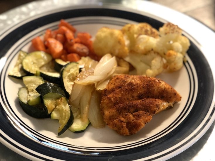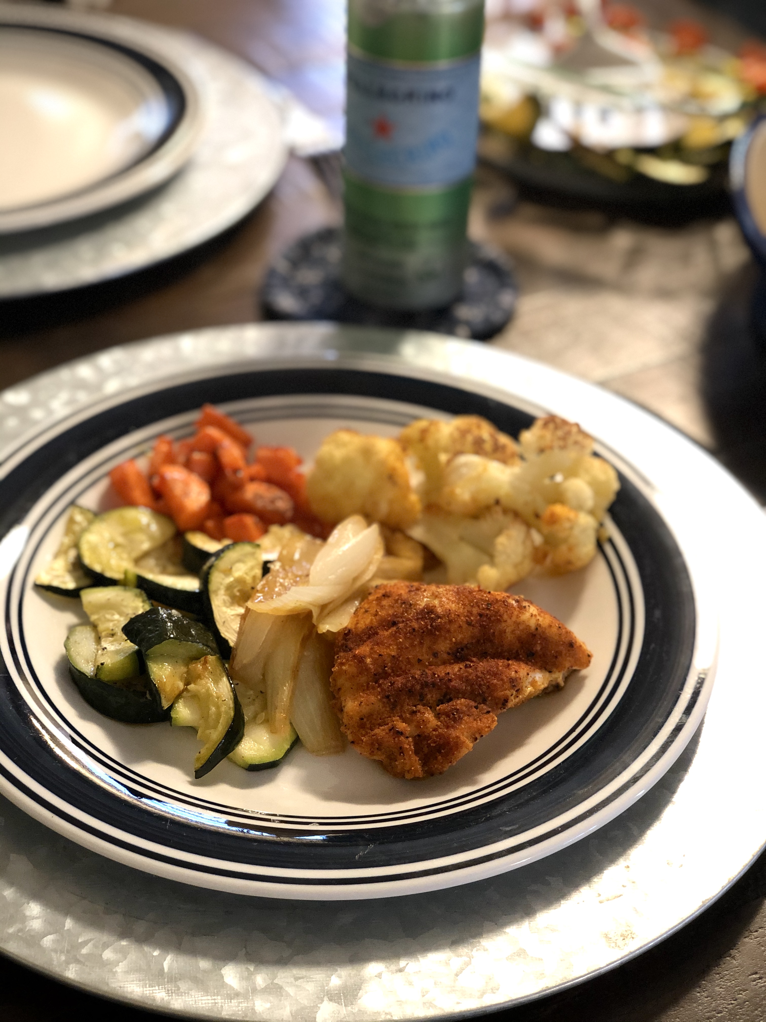 Lori recommends roasting veggies with the chicken for an easy one-pan meal. At the time I made this recipe, I was using up my fresh produce out of my fridge because my husband and I were getting ready to fly out to Arizona to visit my parents. So I didn’t have a lot of fresh veggies to roast, but I did have some onion, cauliflower, carrots, and zucchini. It was kind of a random combination but it ended up tasting so yummy! I roasted the carrots and zucchini separately but I threw the cauliflower and onions in the pan with my chicken breasts, which ended up being a great decision.