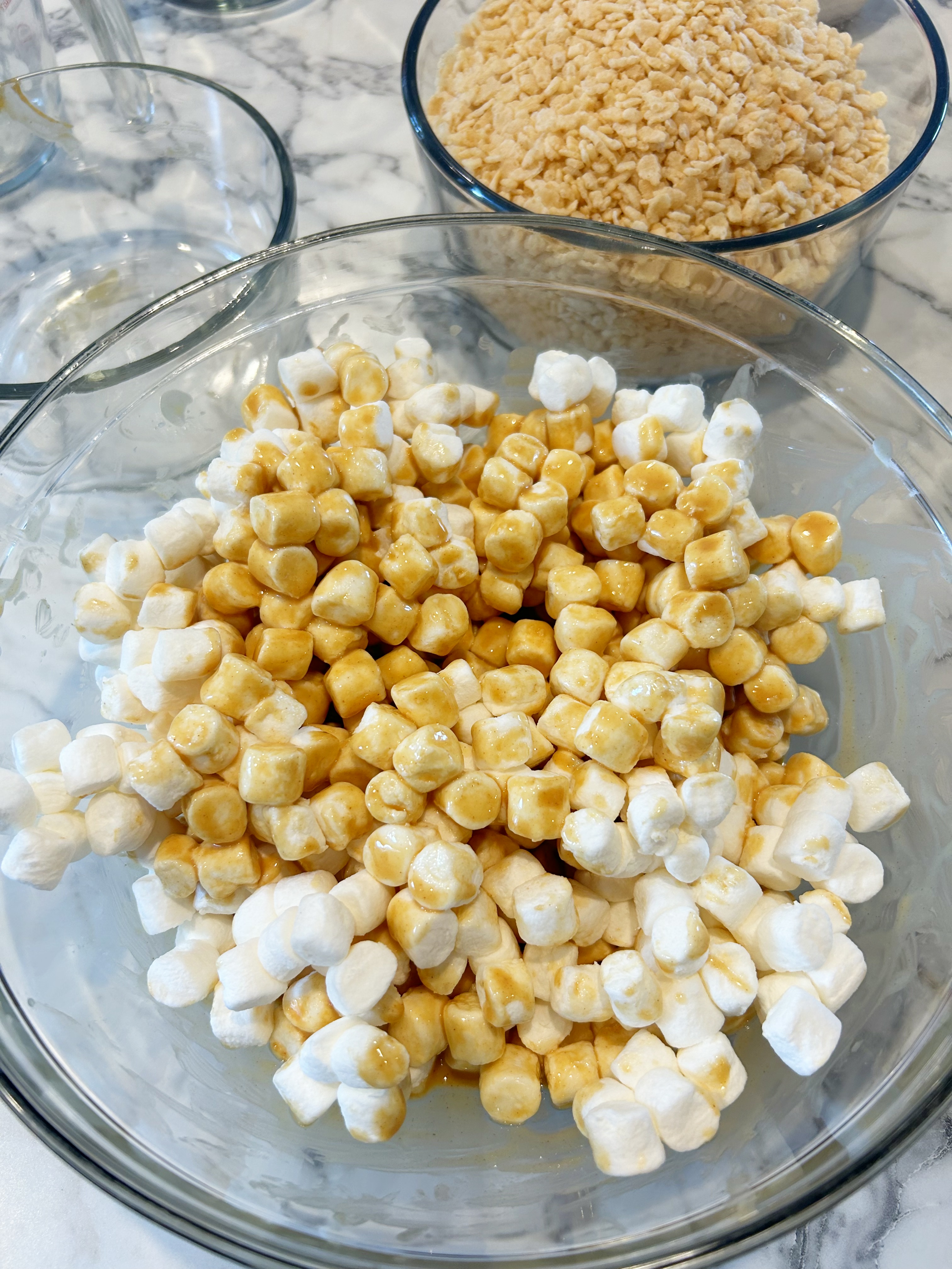 Toss your marshmallows in the sauce and put back in the microwave for just a minute. Then mix all the cereal in, working quickly!