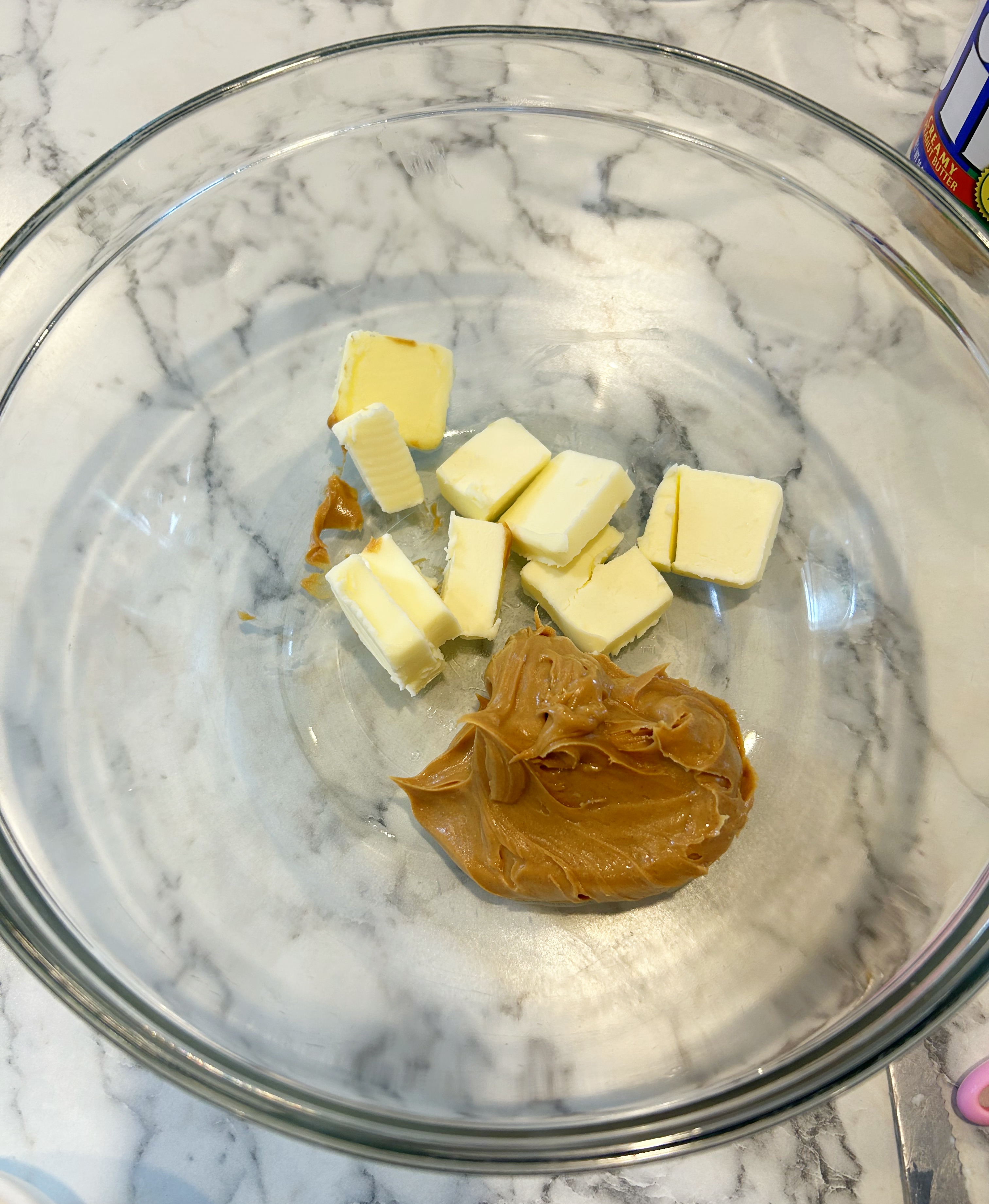 It’s so easy to make this in the microwave! Start with a large glass bowl, and melt your butter and peanut butter together.