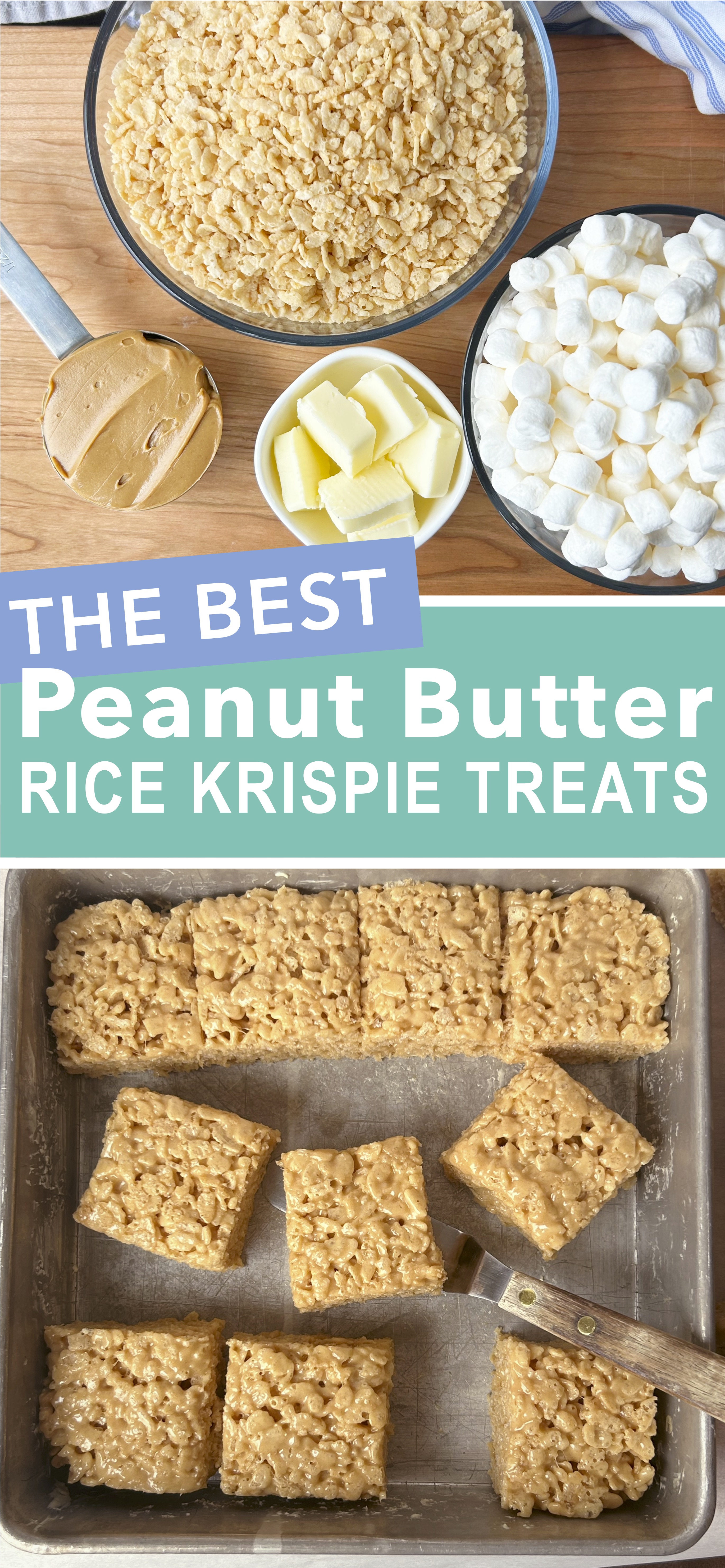 If you’ve made marshmallow cereal treats before, you know how simple this dessert is. Because we love peanut butter so much in my house, I had to try adding some peanut butter and the result is PERFECT!