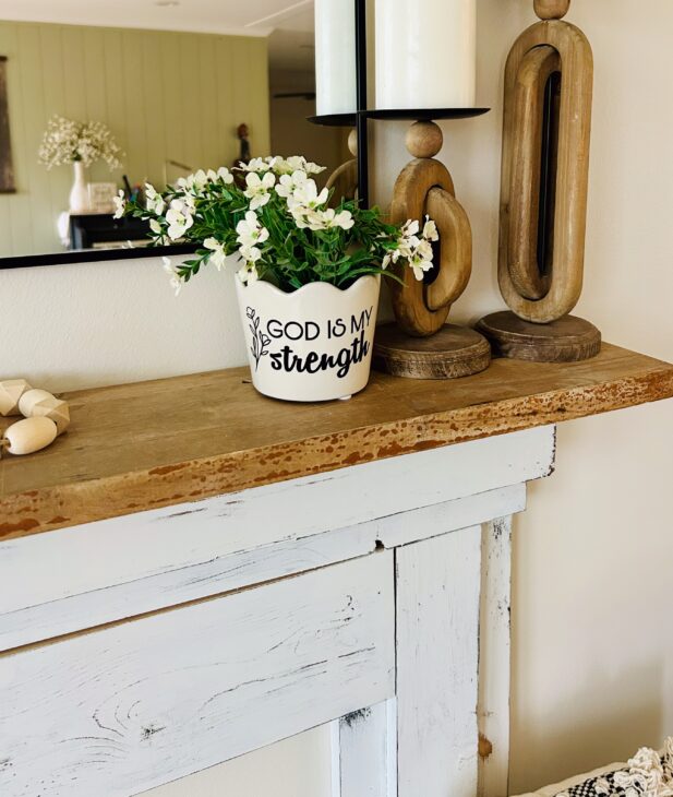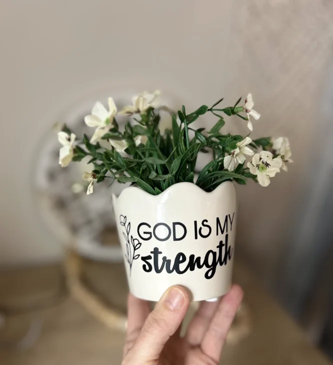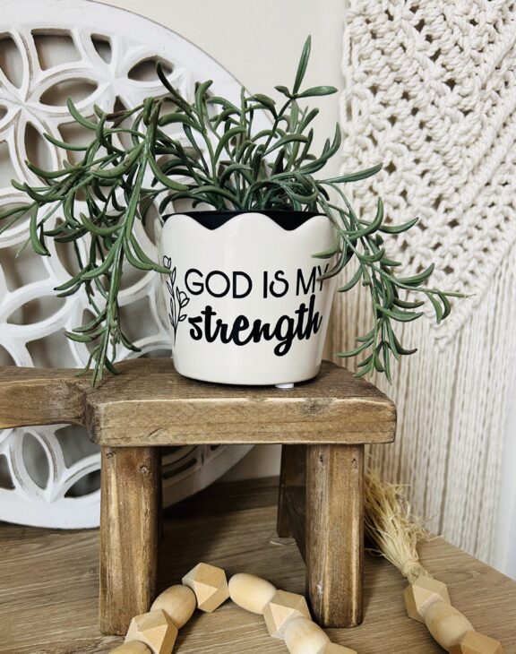 Adding vinyl to a ceramic pot is one of those Cricut projects that looks high-end but is actually super approachable—even if you’re fairly new to crafting. Today I’m walking you through how I added the quote “God is my strength” to a cream scallop-edge ceramic pot that I got from Walmart… link HERE. It is so cute, it will likely sell out, so here is one on Amazon that wood also work. But you can use any pot that you have on hand or find that you love. I added this by using black vinyl and my Cricut Explore Air 2. The best part? The quote is already designed and ready to use, so you can jump straight into making.