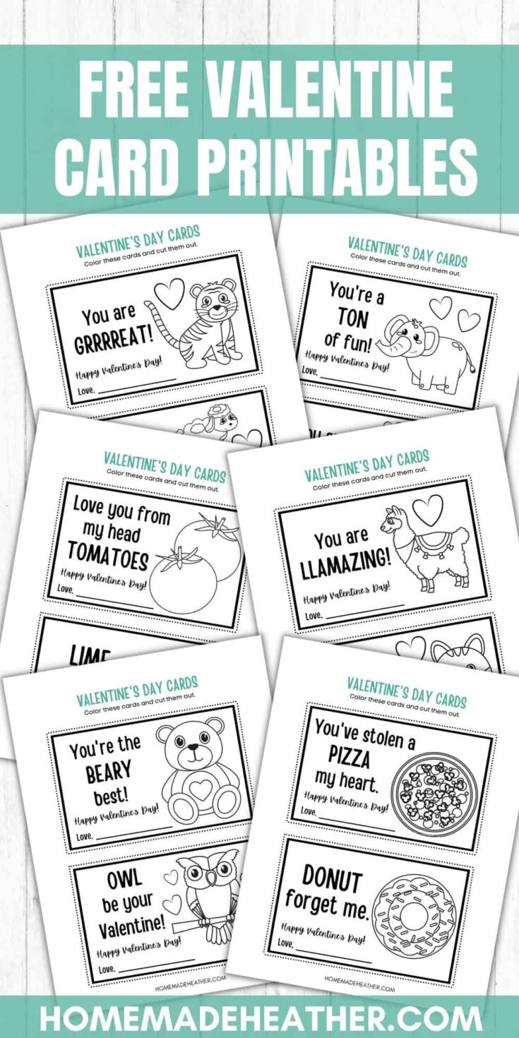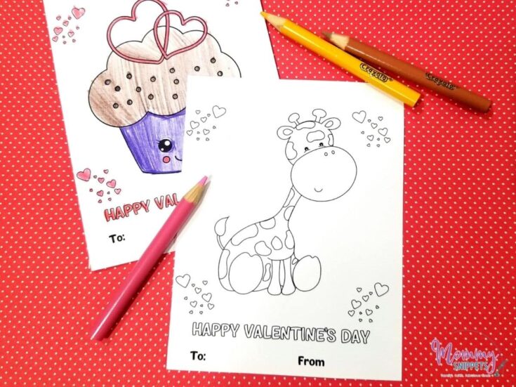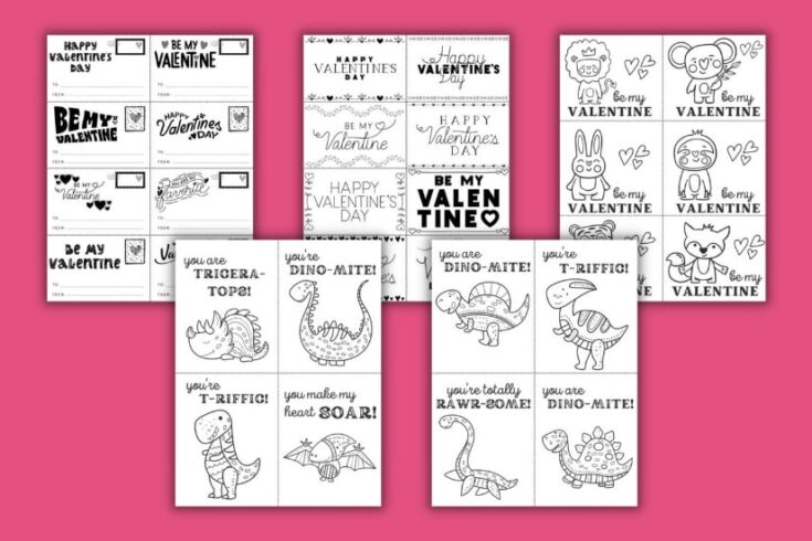 • Elementary school – Cute valentines, cute animals, coloring pages like a free printable coloring valentine’s card, dinosaur valentine options, and simple cut-and-give cards.