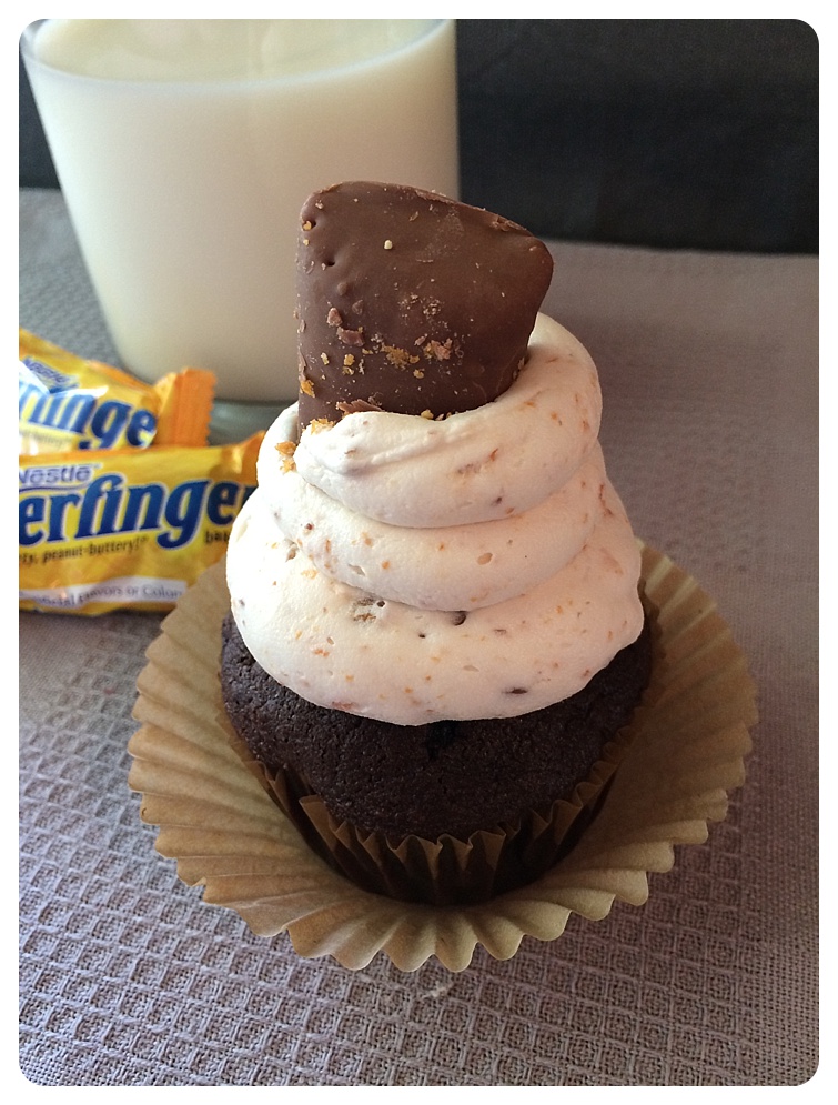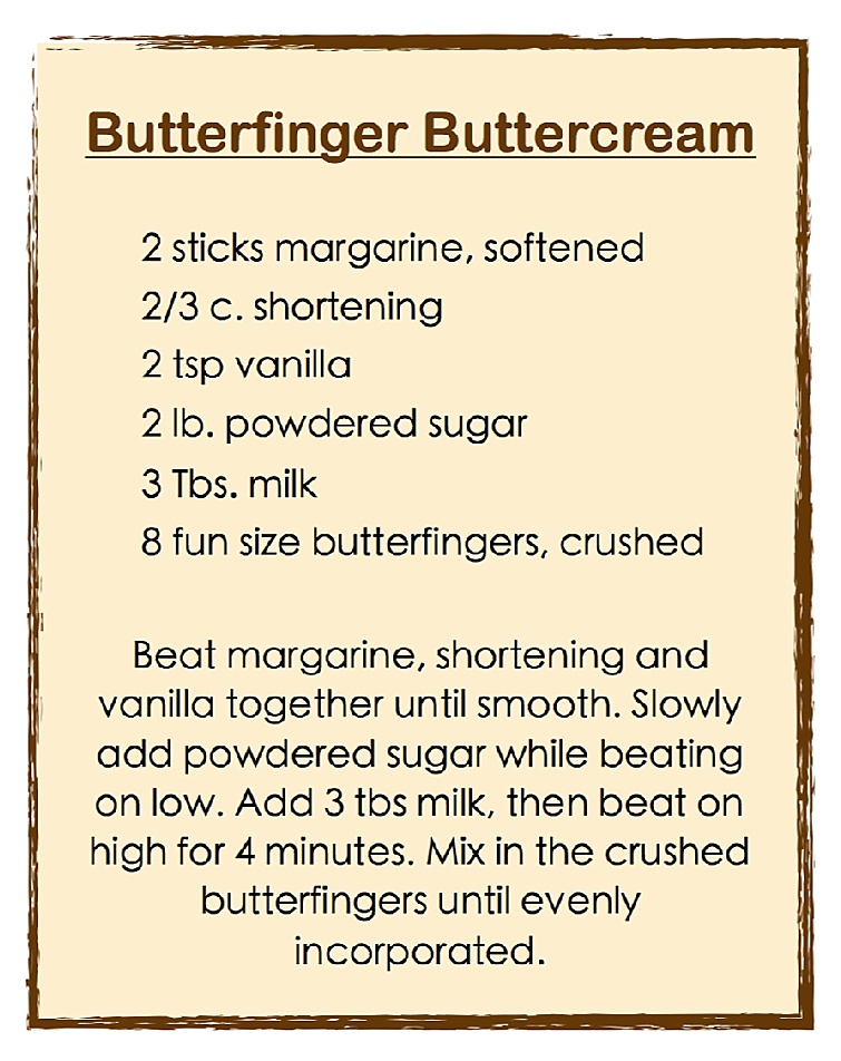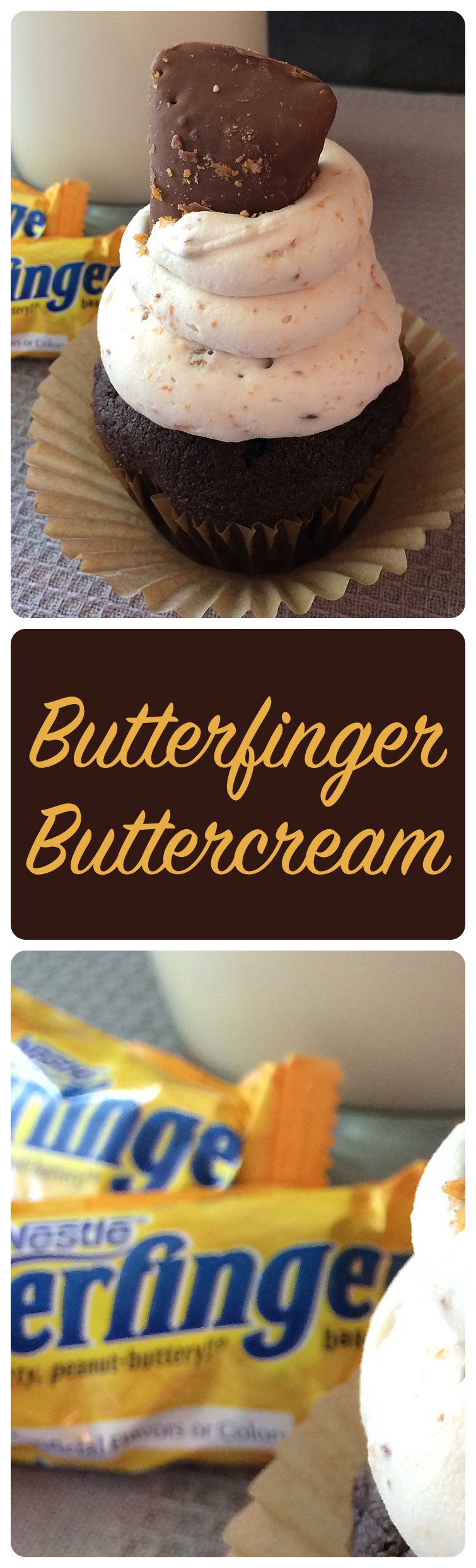 This quick butterfinger buttercream is a very simple recipe that is amazing enough to wow your friends and family on a special occasion, but also easy enough for any day! Use it to top cupcakes, brownies, cookies, cake….. whatever you choose! I like to use it to top my favorite chocolate cupcakes and then finish it off with a piece of a butterfinger candy bar.