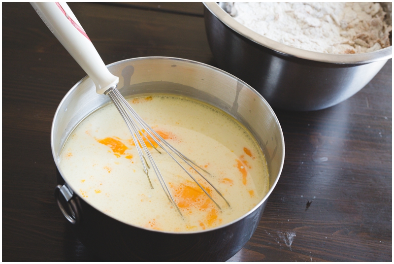 - Pour the wet ingredients into the dry ingredients and mix by hand until combined.