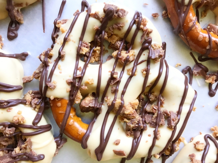 I like using Snyder’s Olde Tyme Pretzels for this recipe because you get more pretzel to counter the sweetness than if you were using mini pretzel twists. You also have a larger area for the chopped Reese’s to adhere!