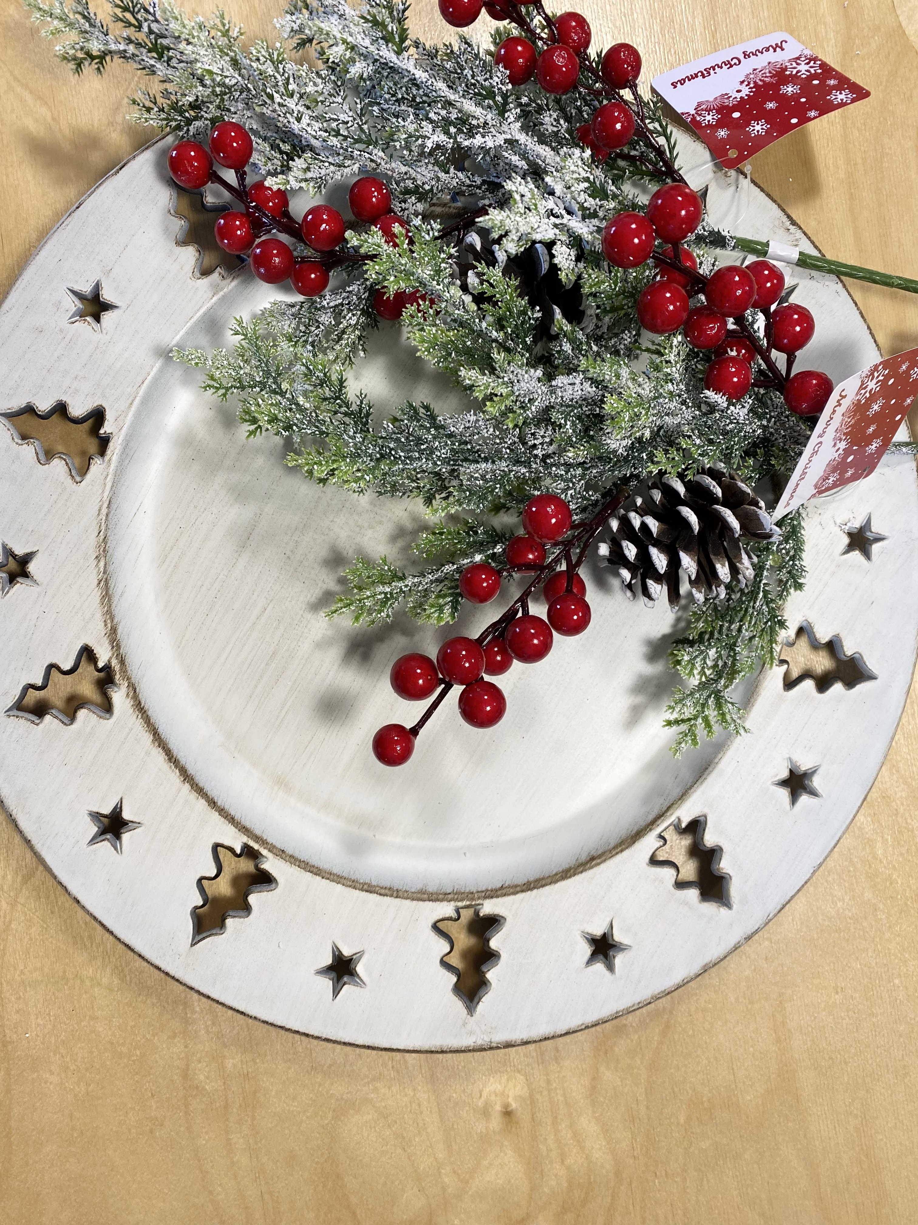 - Next you will want to choose a few Christmas faux florals that match your Christmas charger. I chose natural pines and berries, but you could also do a selection of golds and neutrals, blues, or bright greens and reds.