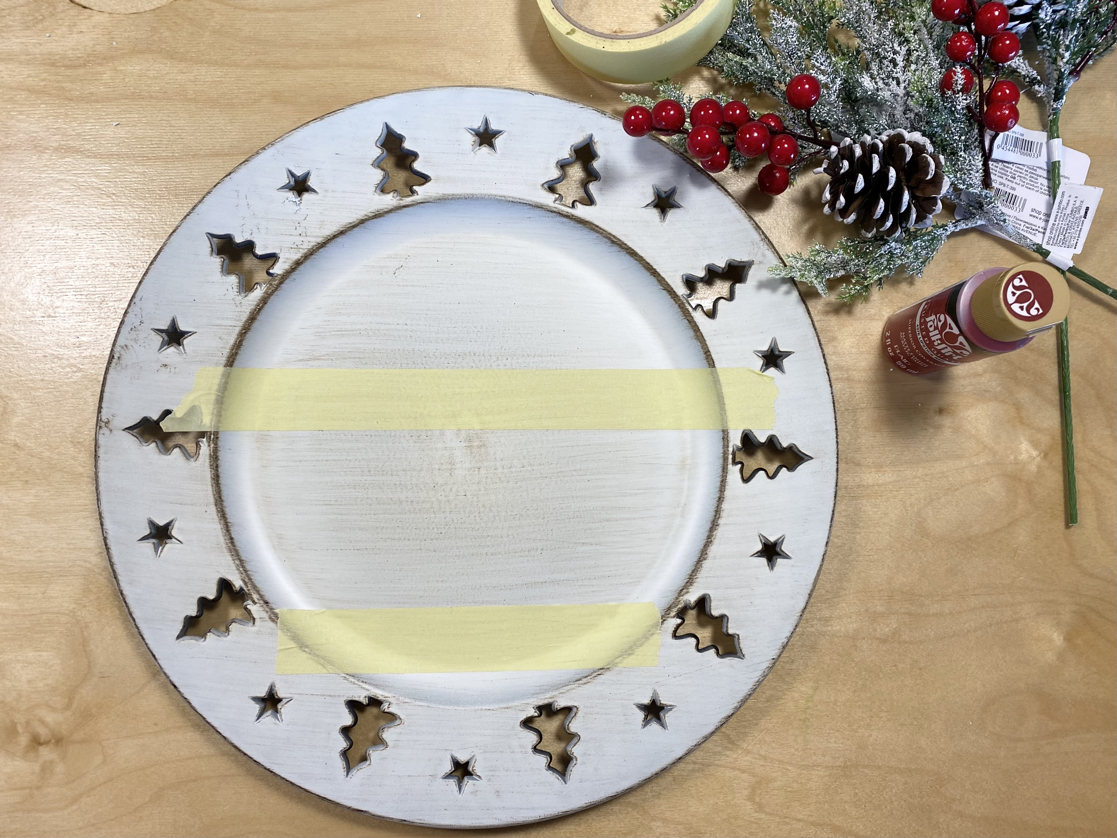 3. Next you will want to section off a strip of your charger to paint red and to write the word “christmas” on. I love the red paint against the cream color of my charger, but you could always paint this strip black, green, white . . . once again choose whatever fits your decor style!