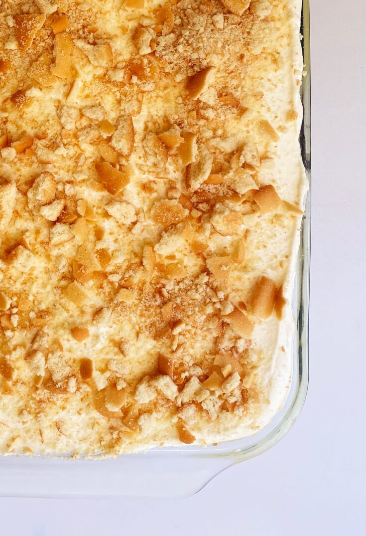 Finally, the dessert is topped with a banana whipped cream mixture and crushed vanilla wafers and optional sliced bananas. The whipped cream adds a light and fluffy texture to the cake, while the crushed wafers add a delicious crunch. Tip here: if you wait to add the crushed vanilla wafers until right before serving, they will have a nice crunch to them when you do serve it. Top with sliced bananas right before serving; if you put them on sooner, they will turn brown and yucky looking.