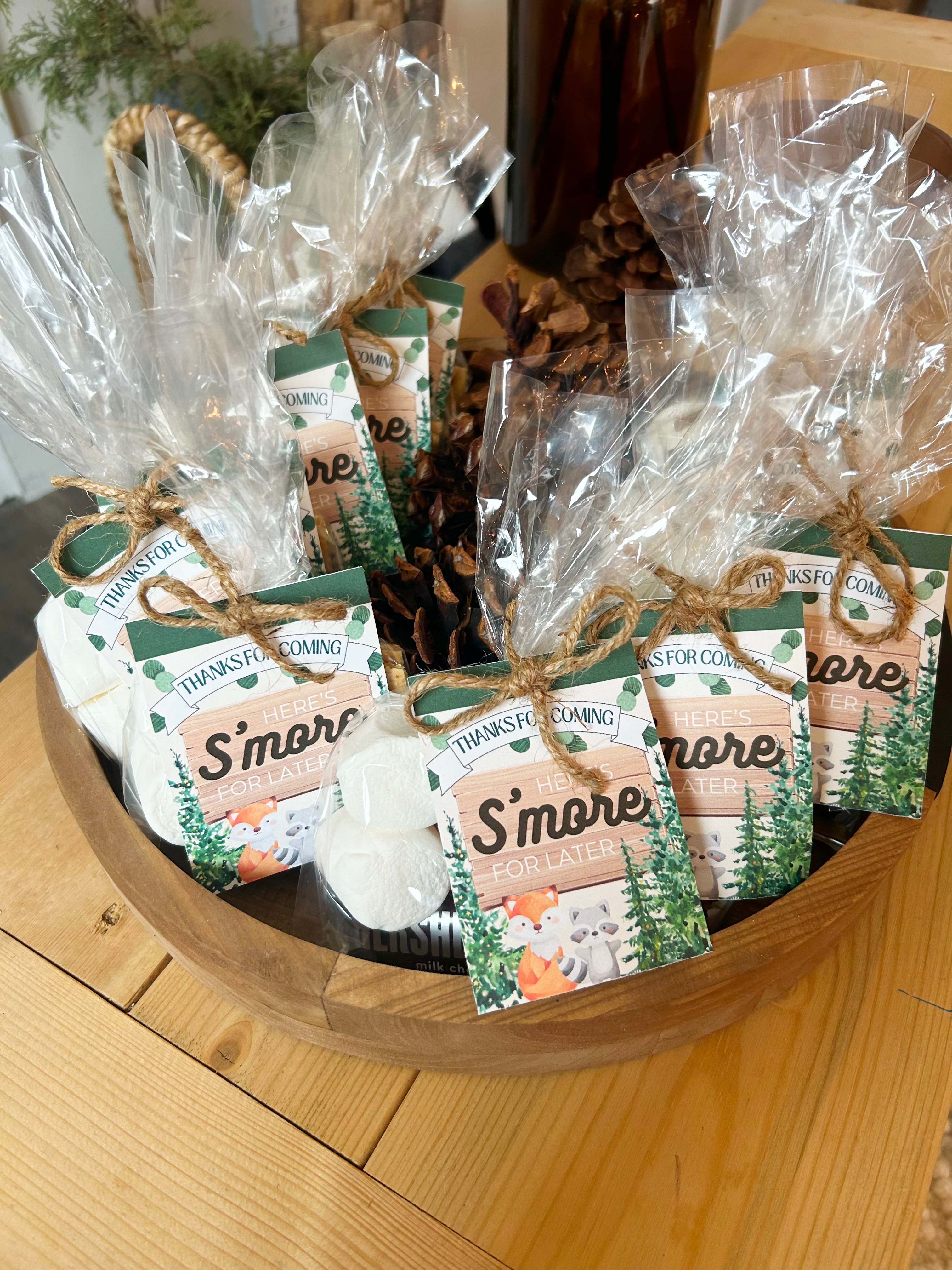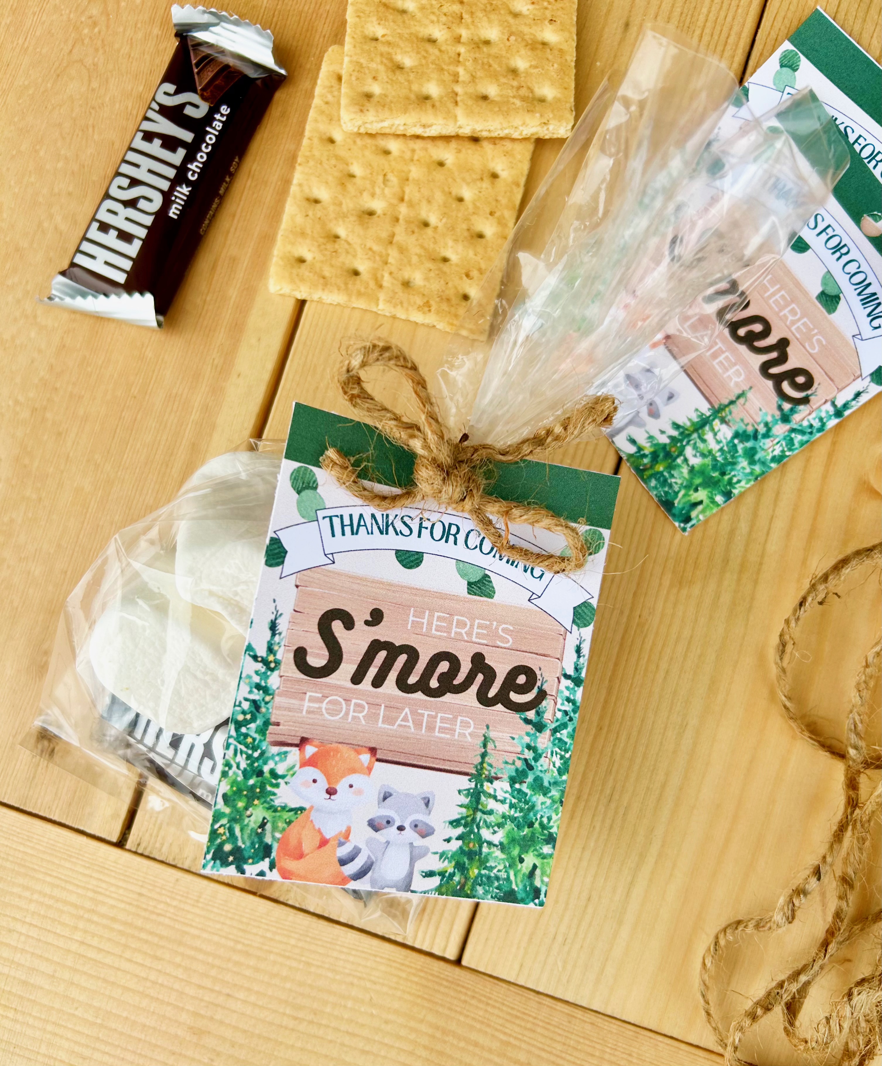 Put 2 graham crackers, 2 marshmallows and a Hershey bar in each bag. Close the bag and attach the tag with twine. Your guests are going to love these Woodland Shower favors!
